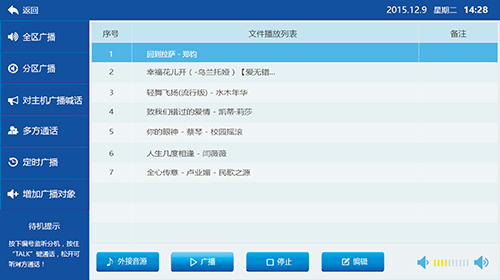 定時廣播:支持按單區、多區、全區設定時間和設定周期,進行MP3文件廣播。