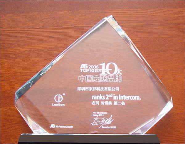 以下是2006度被評為中國安防行業十大品牌榮譽獎牌: