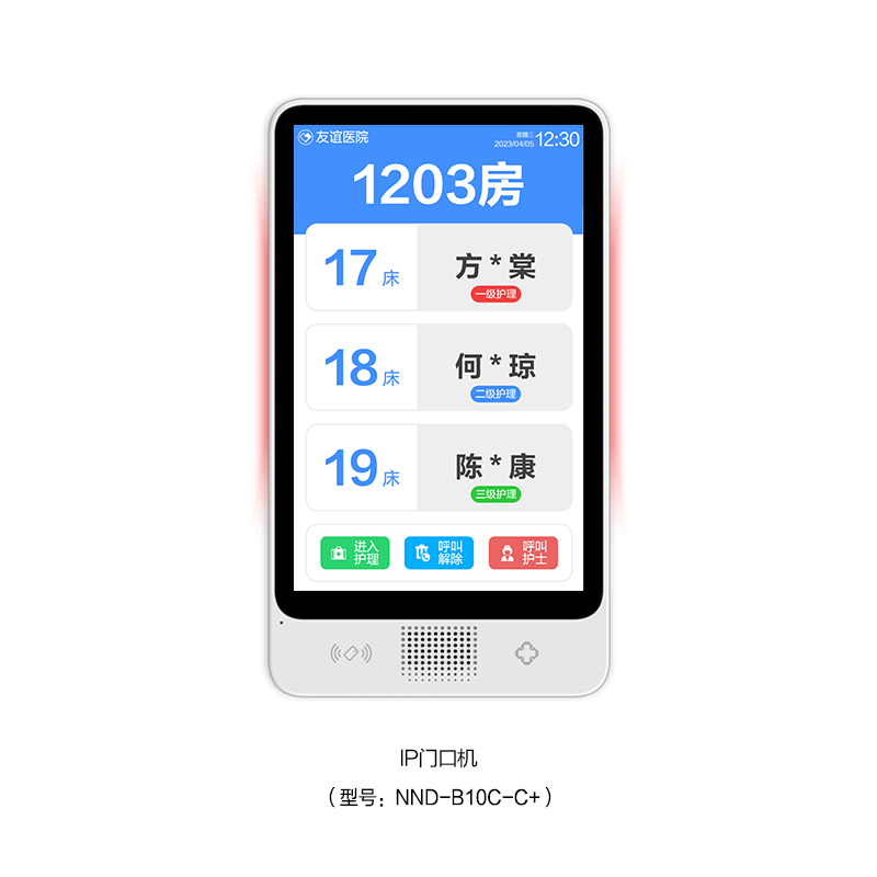 ? 采用10.2英寸高清液晶顯示屏,內置燈帶雙側發光設計,壁掛式安裝在病房門口。