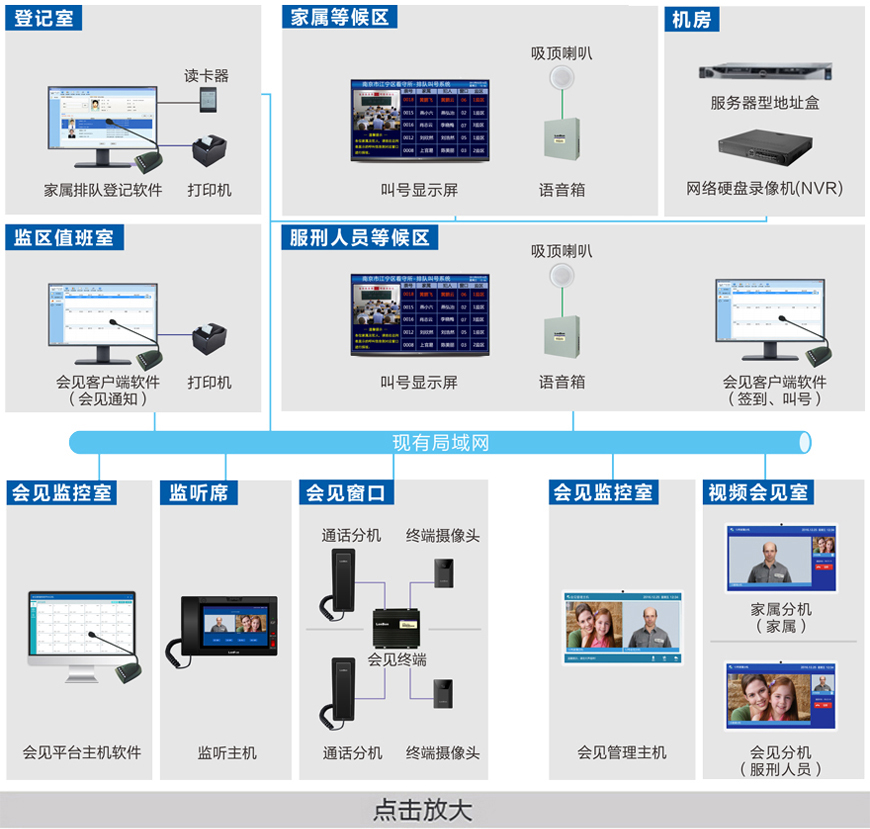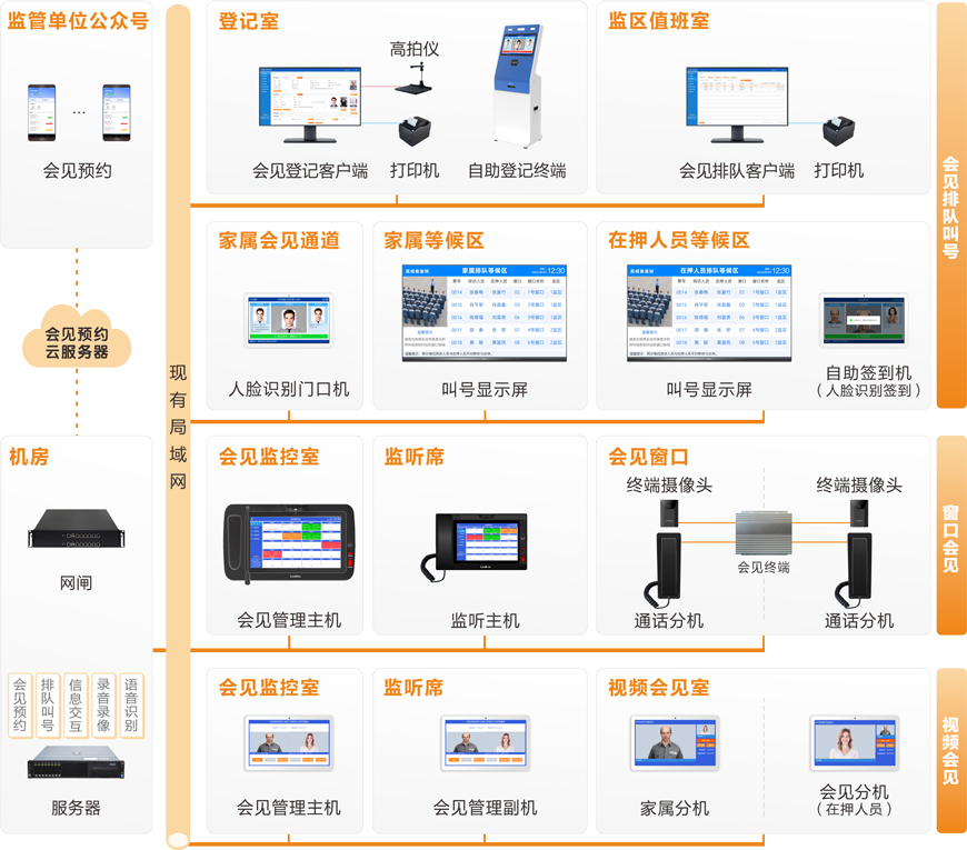 家屬會見管理系統 采用IP網絡架構,系統包括取號排隊、會見登記、會見通知、排隊叫號、會見監管、錄音錄像、復聽審查、獄務公開查詢等管理模塊,采用IP網絡音視頻通訊、雙攝像機監控、雙畫面合成、人臉識別、語音識別等技術,設計出一套更符合監獄家屬會見監管業務需求的智能化系統。