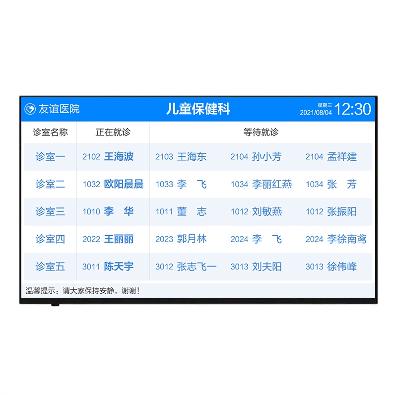 ? 采用65英寸高清液晶顯示屏,壁掛或吊裝(支架需另購)在門診等候區。