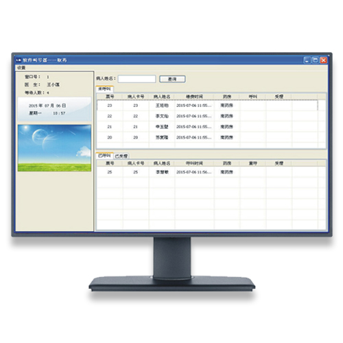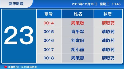 等候區顯示屏顯示:支持42寸以上的液晶顯示器顯示當前各窗口取藥患者姓 名、號碼、狀態、多媒體視頻文件。