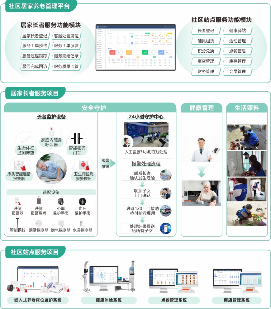以“ 安全守護”為核心,依托平臺的資源整合與功能支撐,開展居家長者服務項目和社區站點服務項目。