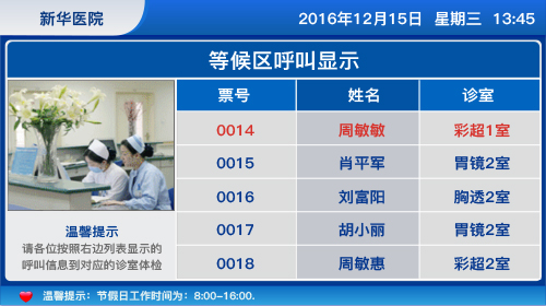 診室門口液晶屏顯示:可顯示診室號、體檢人員姓名、體檢人員號碼信息等。