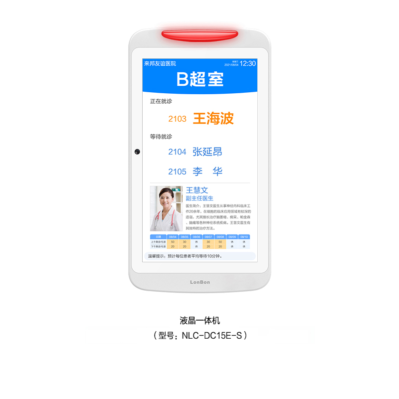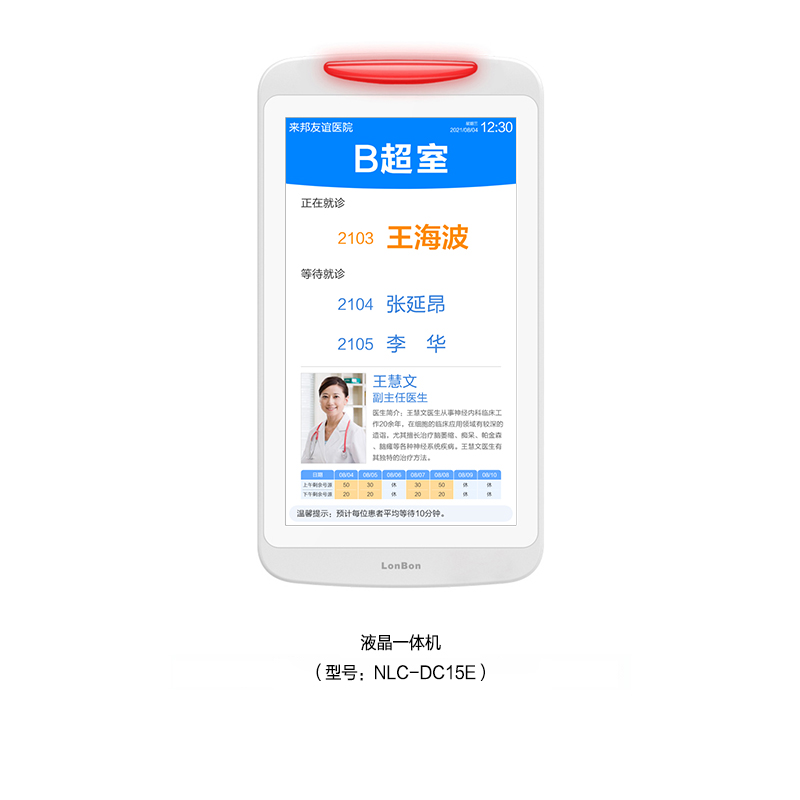? 采用15.6英寸液晶顯示屏,內(nèi)置燈帶雙側(cè)發(fā)光設(shè)計(jì),壁掛式安裝在檢查室門(mén)口。