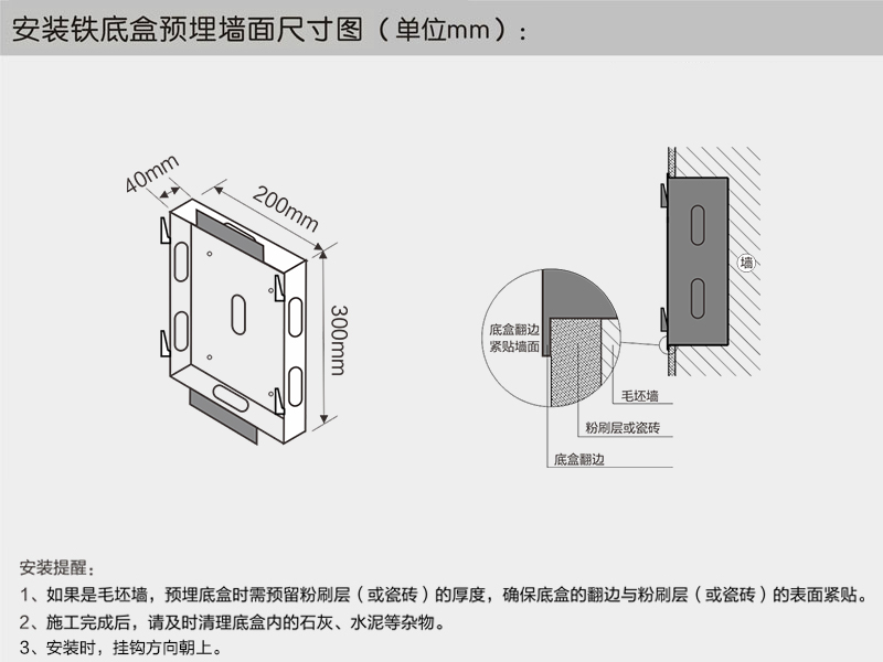 安裝鐵底盒預(yù)裝墻面尺寸圖。