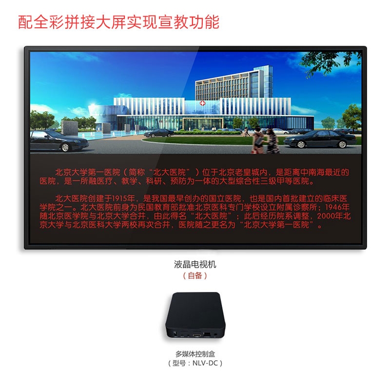 局域網傳輸,多媒體控制盒(型號:NLV-DC)可通過HDMI線外接液晶顯示屏 、電視機、全彩拼接屏(矩陣)等顯示設備(顯示設備需自備)。
