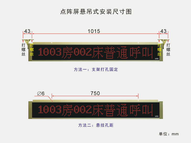 鋁合金邊框,雙面單行十漢字滾動顯示,吊裝在病區走廊。