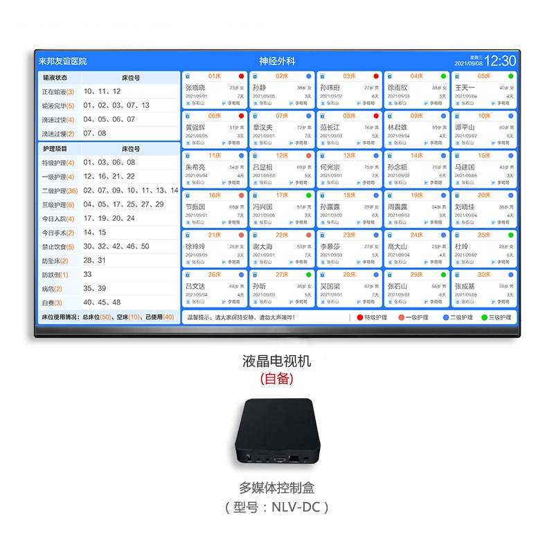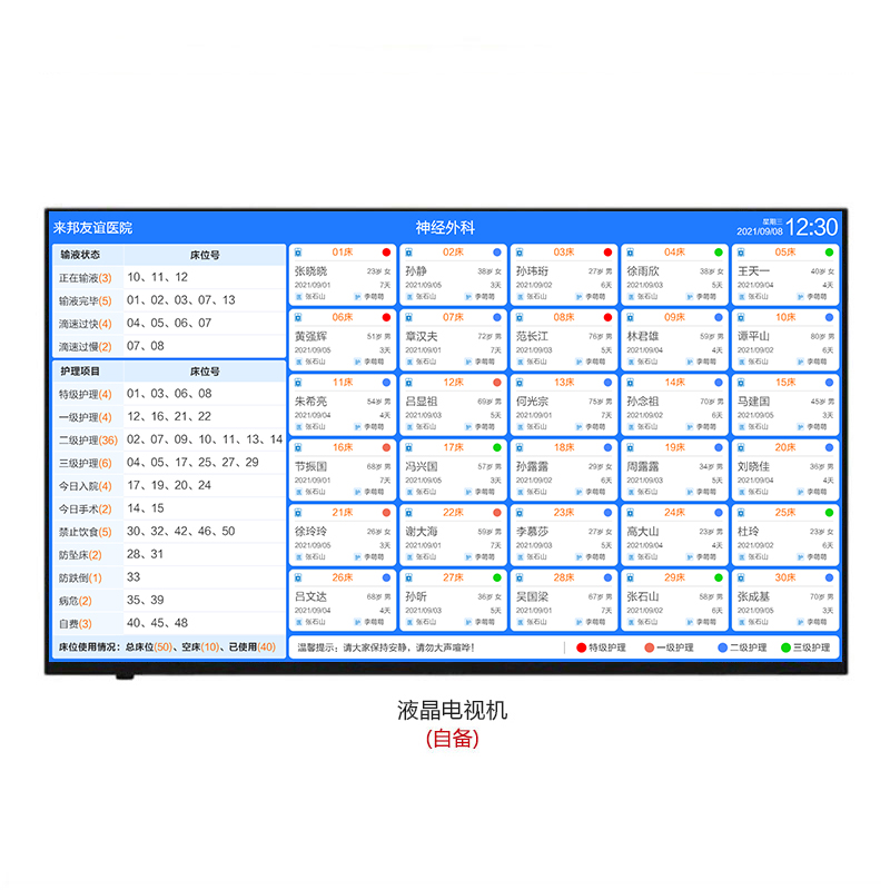 支持同步顯示病區(qū)患者、病區(qū)床位、值班醫(yī)生、值班護士等信息。