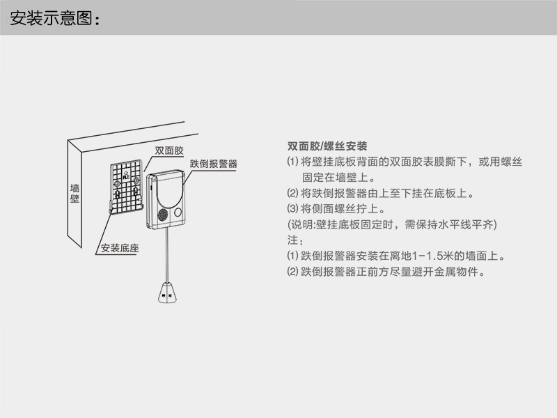② 集中供電:支持電源箱(推薦12V/5A)集中供電,預留RVV2x1.0線,30米內可給2臺跌倒報警器供電(與商務聯系)。