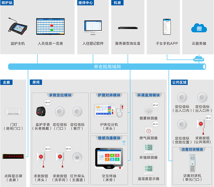 長者在床上感到不適,按下床頭的手持呼叫鍵,照護(hù)站主機(jī)能立刻收到呼叫并伴有語音播報(bào)長者信息,門燈、走廊屏也同步發(fā)出呼叫提醒,護(hù)理人員接聽后可與長者建立通話。