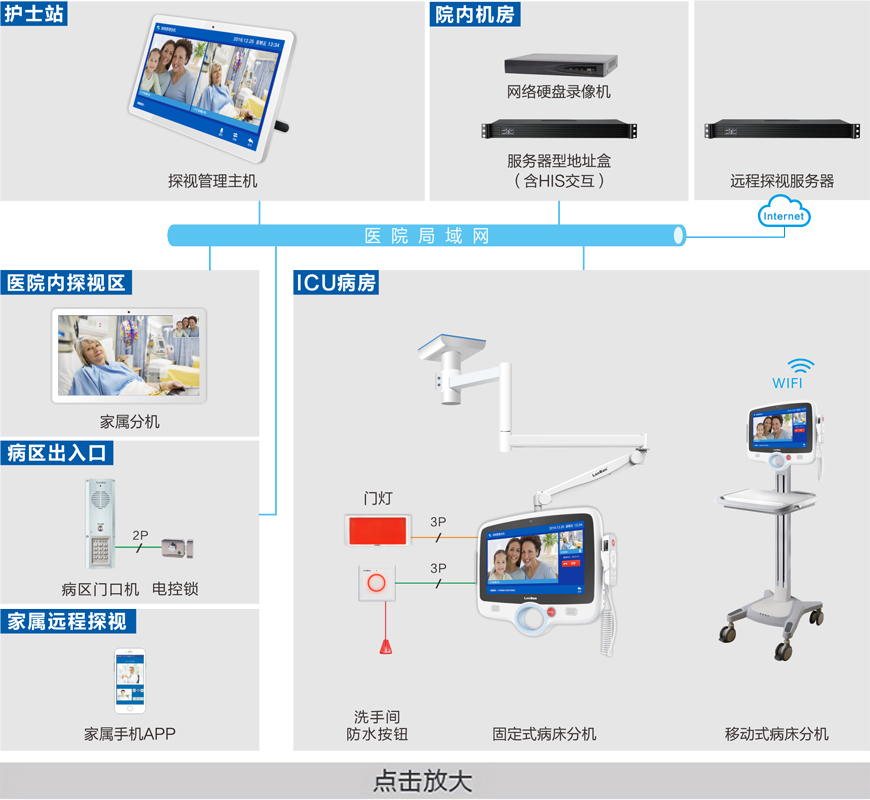 患者病情危重或手術(shù)后入住ICU病房,為了患者的早日康復(fù),防止患者在院內(nèi)受到外界感染的發(fā)生,ICU患者禁止家屬陪護(hù)。由于家屬、患者相互隔離,需要一套視頻清晰度高、語音溝通順暢的探視系統(tǒng),為家屬與患者間的提供便捷溝通的橋梁。