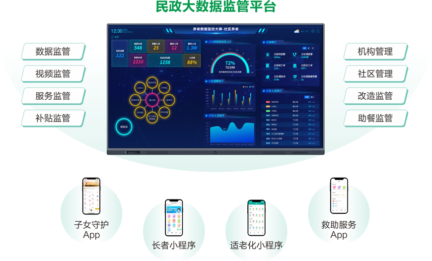 民政監管平臺 是機構、社區、居家養老運營管理,實施安全監護和照料服務基礎,同時能統一監管轄區內所有機構、社區、居家養老運營數據。